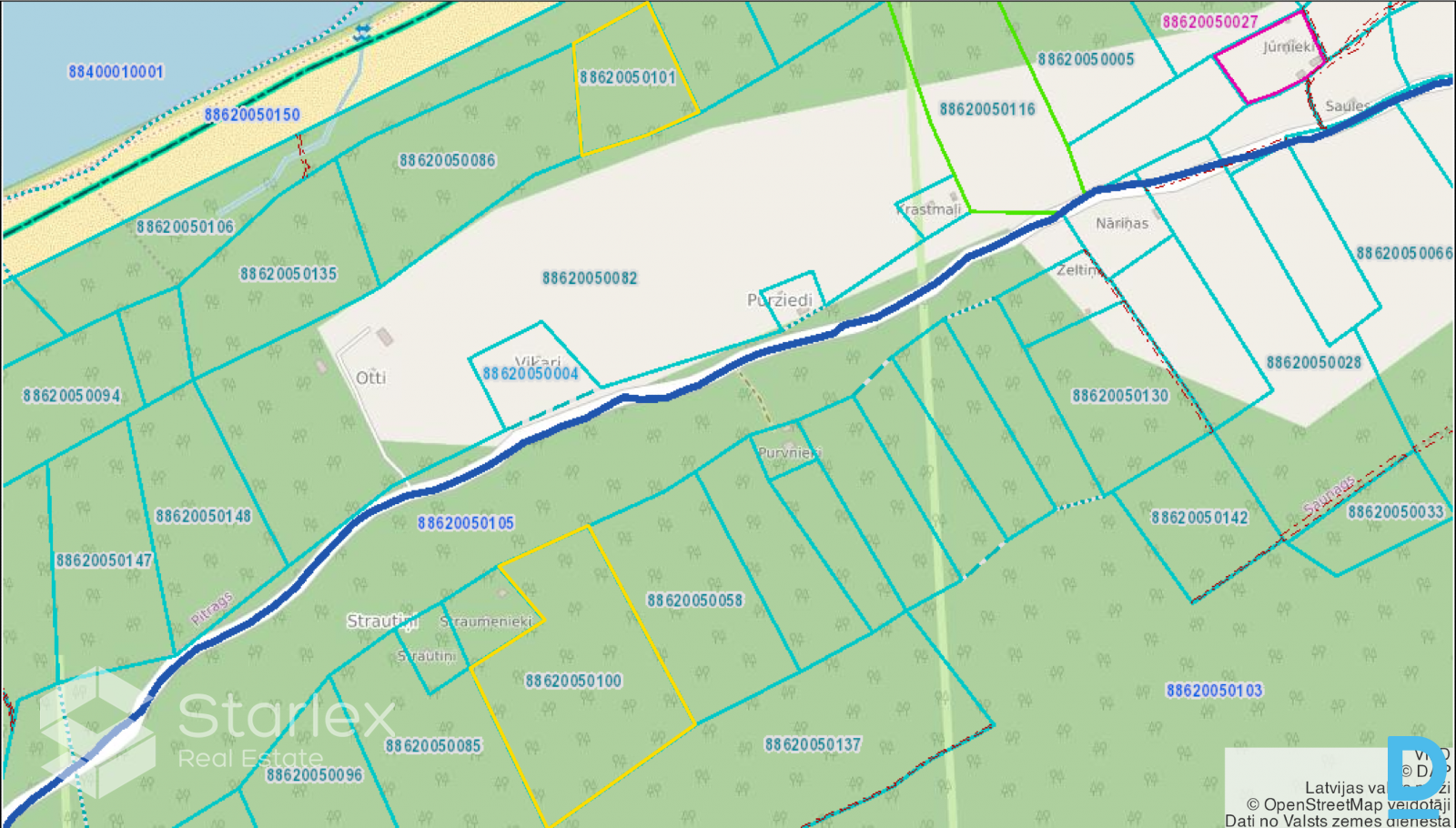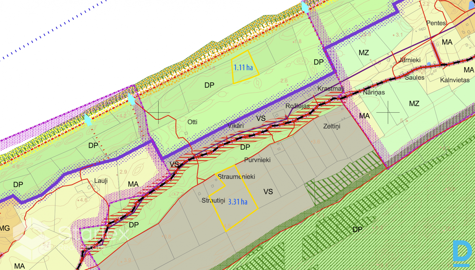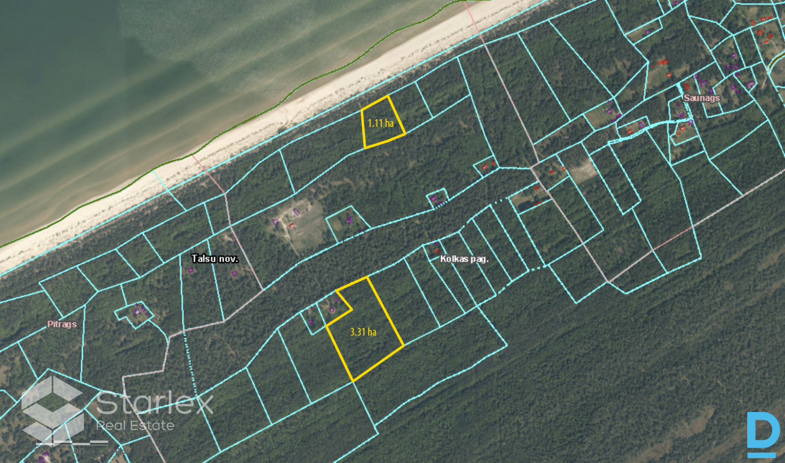 | Pārdod nekustamo īpašumu "Zelmeņi", kas atrodas Lībiešu krastā starp Saunaga un Pitraga ciematiem. Nekustamais īpašums sastāv no 2 zemes vienībām - viena no tām ar platību 1,11 ha atrodas pirmajā līnijā no jūras, otra ar platību 3,31 ha - tālāk no jūras pie meža ceļa, kas savieno Saunagu ar Pitragu. 4 ha no kopējiem 4,42 ha ir meža zeme, pārējā platība - krūmāji. Zemes gabalu funkcionālā zonējuma kodi spēkā esošajā Kolkas pagasta teritorijas plānojumā - DP (Dabas pamatne) un VS (Viensētu teritorija). Attiecīgi uz 1,11 ha zemes gabala nav iespējama apbūve, bet uz 3,11 ha zemes gabala ir iespējama 1 stāva (ar jumta izbūvi) savrupmājas vai viesu mājas būvniecība. Maksimālais apbūves blīvums zemes vienībā - 2%, maksimālā apbūves intensitāte zemes vienībā - 3,3%. Nelielas elektrības pievilkšanas izmaksas 3,31 ha zemes vienībai. Attālums līdz Rīgai - 170 km, līdz Talsiem - 65 km, līdz Ventspilij - 70 km. | |